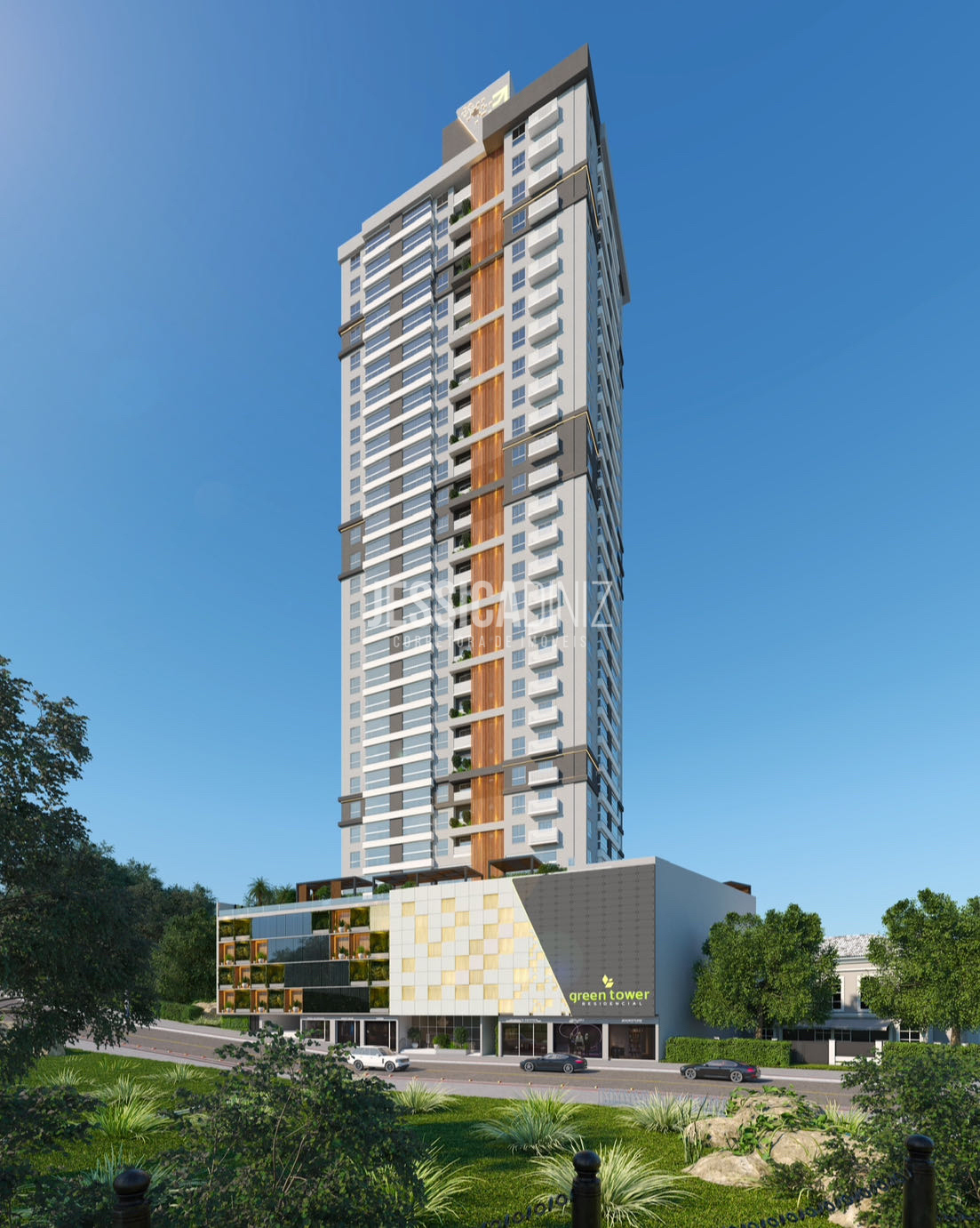 Empreendimento com lojas comerciais no térreo, 4 pavimentos de garagem, 2 pavimentos de área de lazer.